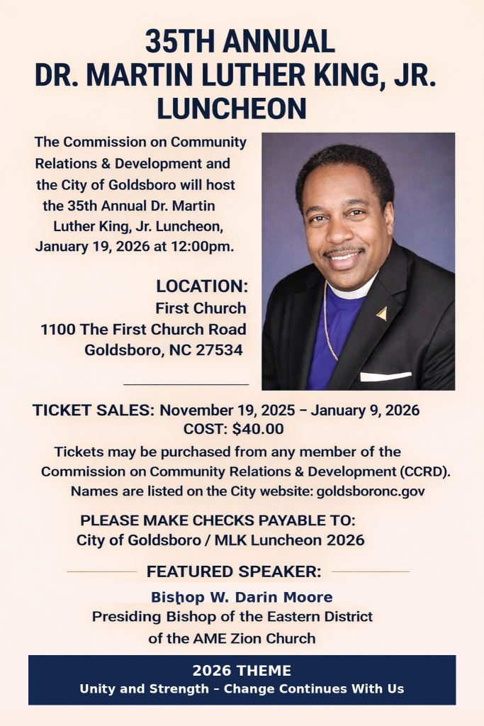 Tickets for the luncheon are $40. Tickets may be purchased from any member of the Commission on Community Relations and Development. Names are listed on the city’s website, www.goldsboronc.gov. The deadline to purchase tickets is Jan. 9.
